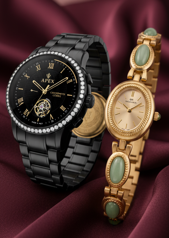 The His and Hers Bundle is a celebration of shared elegance and refined taste. This exclusive set pairs the Stella Pearl, a stunning women’s timepiece with green gemstone inlays and a radiant gold finish, with the Kronos Zenith, a bold men’s watch that embodies strength, precision, and modern sophistication. Together, they reflect the perfect balance of luxury and craftsmanship, designed for couples who value both beauty and performance. Enjoy 15% off this timeless duo, made to be admired every moment of the day.